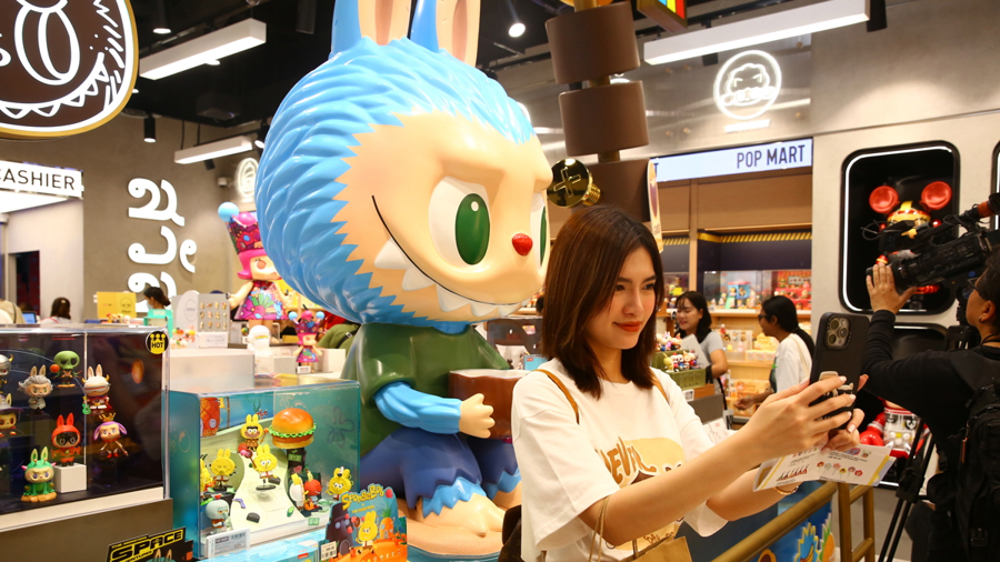在泰国曼谷的泡泡玛特店内,一名女子在拉布布玩偶前自拍。 | 新华社发